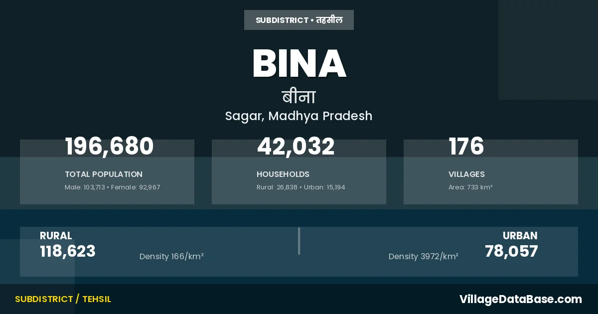 According to the 2011 census The total area of Bina Tehsil is 733 km², with a population of 196680 people. The population density is 268 inhabitants per square kilometre, and there are approximately 42032 houses in the sub district.