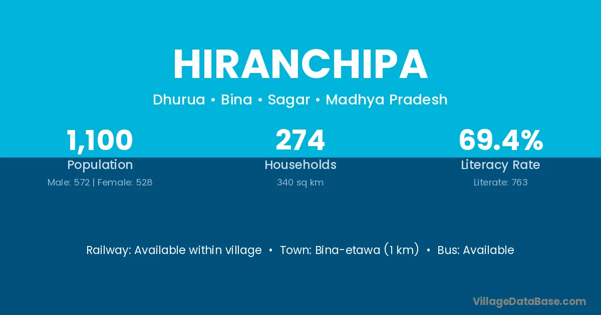 Bina-etawa (1 km) is the nearest town to Hiranchipa village for major economic activities and is located approximately 1 km away.