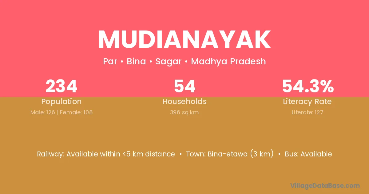 Bina-etawa (3 km) is the nearest town to Mudianayak village for major economic activities and is located approximately 3 km away.