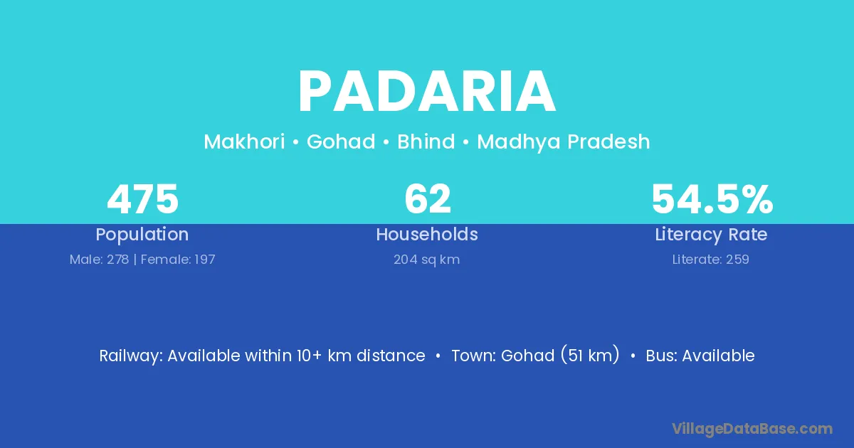Bina-etawa (10 km) is the nearest town to Padaria village for major economic activities and is located approximately 10 km away.