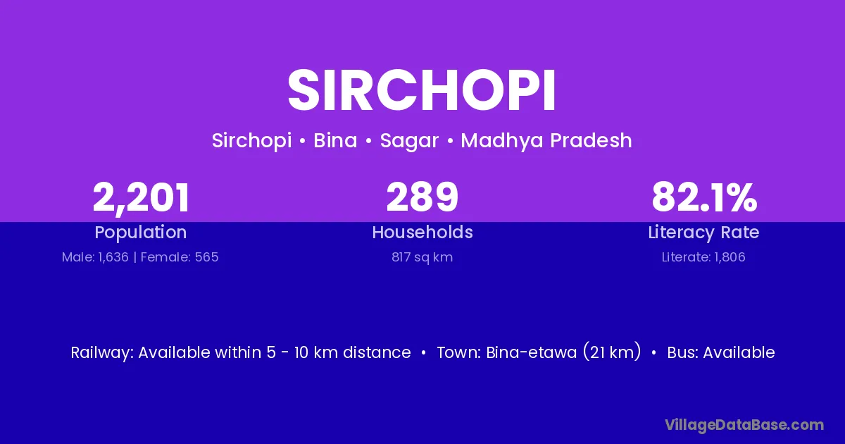 Bina-etawa (21 km) is the nearest town to Sirchopi village for major economic activities and is located approximately 21 km away.
