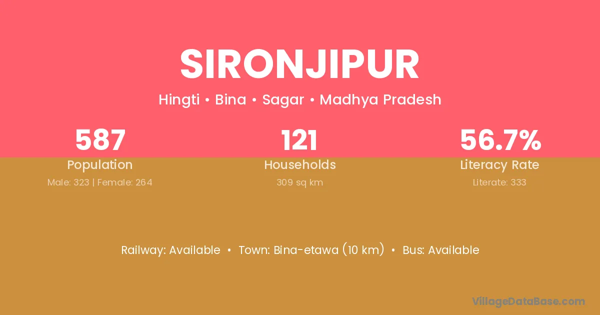 Bina-etawa (10 km) is the nearest town to Sironjipur village for major economic activities and is located approximately 10 km away.