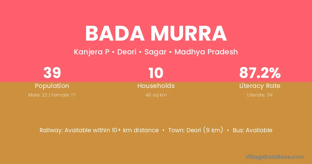 Deori (9 km) is the nearest town to Bada Murra village for major economic activities and is located approximately 9 km away.