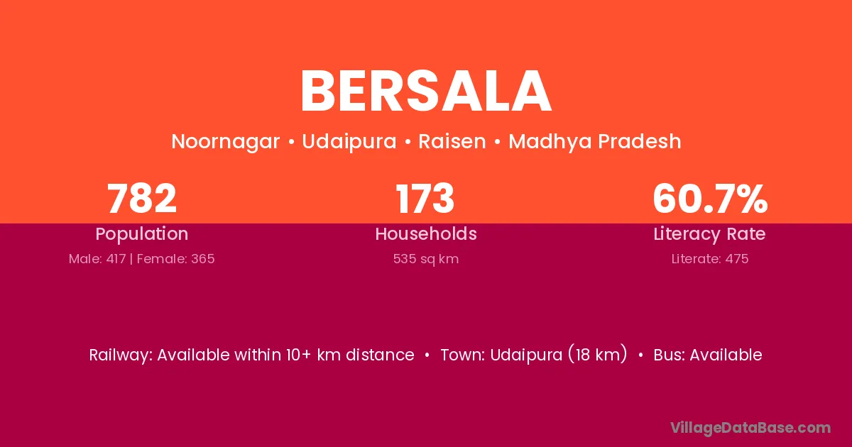 Deori (24 km) is the nearest town to Bersala village for major economic activities and is located approximately 24 km away.