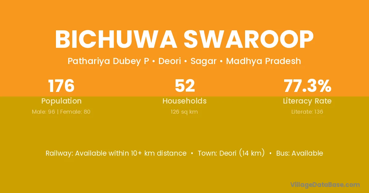 Deori (14 km) is the nearest town to Bichuwa Swaroop village for major economic activities and is located approximately 14 km away.