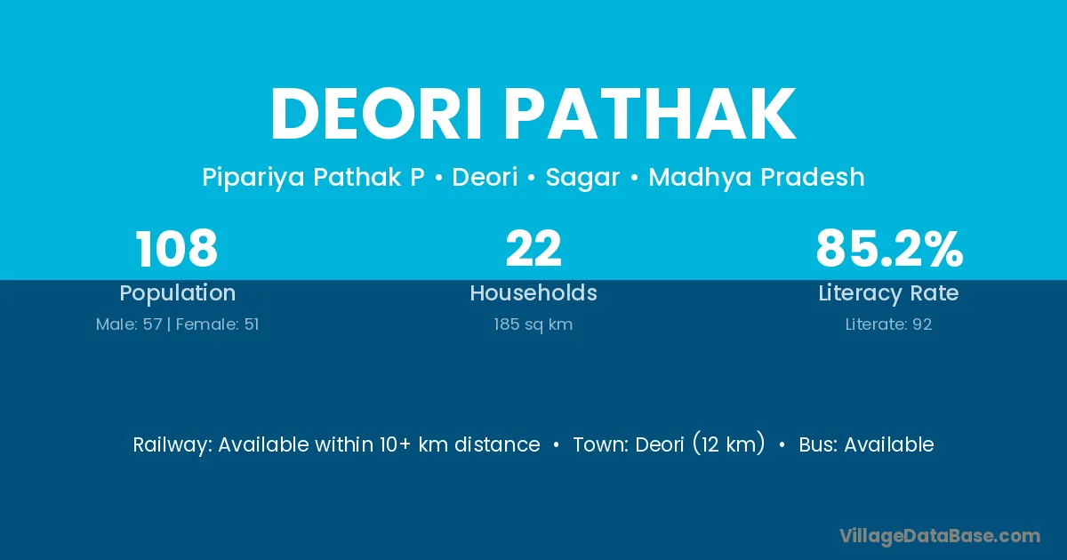 Deori (12 km) is the nearest town to Deori Pathak village for major economic activities and is located approximately 12 km away.