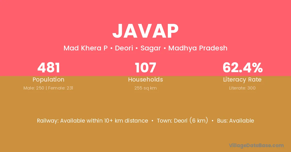 Javap village has a total population of 481 people, of which 250 are males and 231 are females.