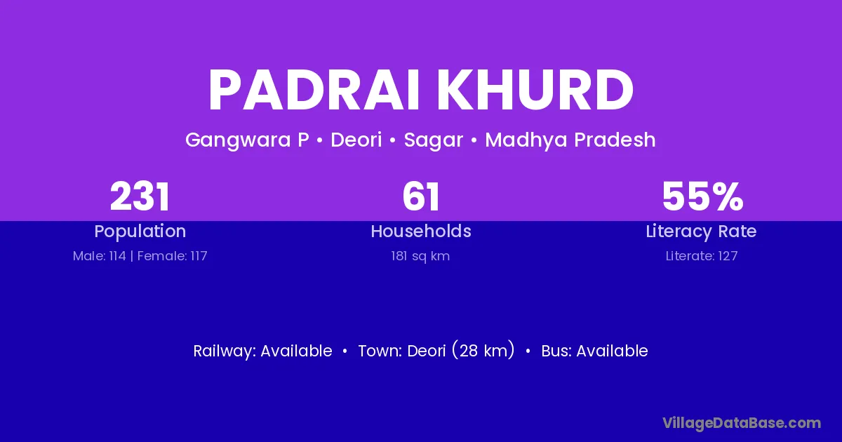 Padrai Khurd village has a total population of 231 people, of which 114 are males and 117 are females.