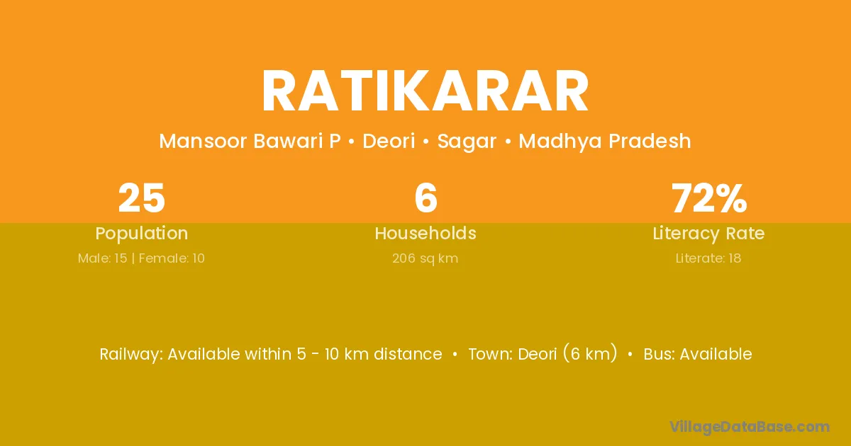Deori (6 km) is the nearest town to Ratikarar village for major economic activities and is located approximately 6 km away.