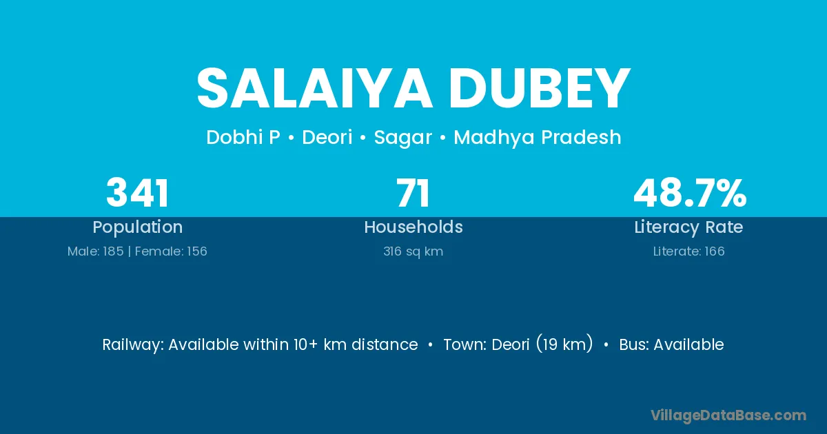 Deori (19 km) is the nearest town to Salaiya Dubey village for major economic activities and is located approximately 19 km away.
