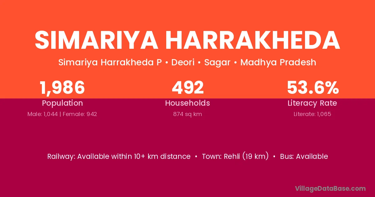 Simariya Harrakheda village has a total population of 1,986 people, of which 1,044 are males and 942 are females.