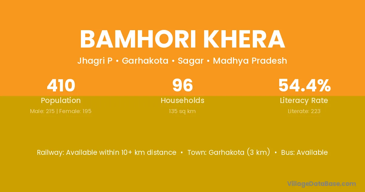Garhakota (3 km) is the nearest town to Bamhori Khera village for major economic activities and is located approximately 3 km away.