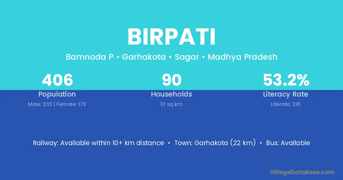 Garhakota (22 km) is the nearest town to Birpati village for major economic activities and is located approximately 22 km away.