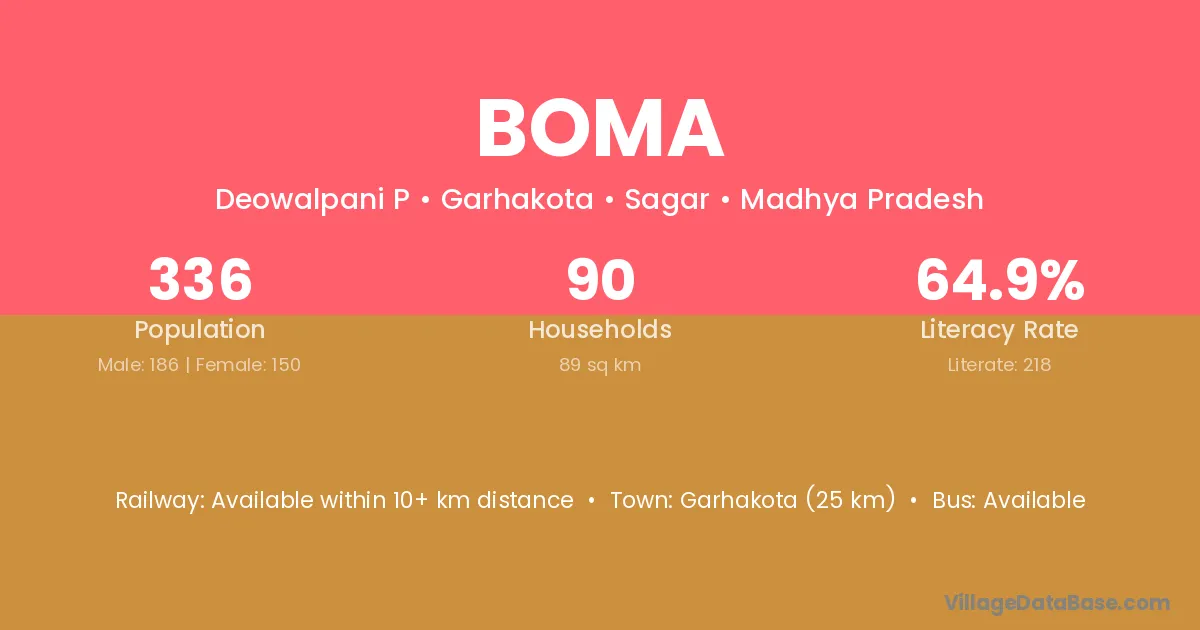 Garhakota (25 km) is the nearest town to Boma village for major economic activities and is located approximately 25 km away.