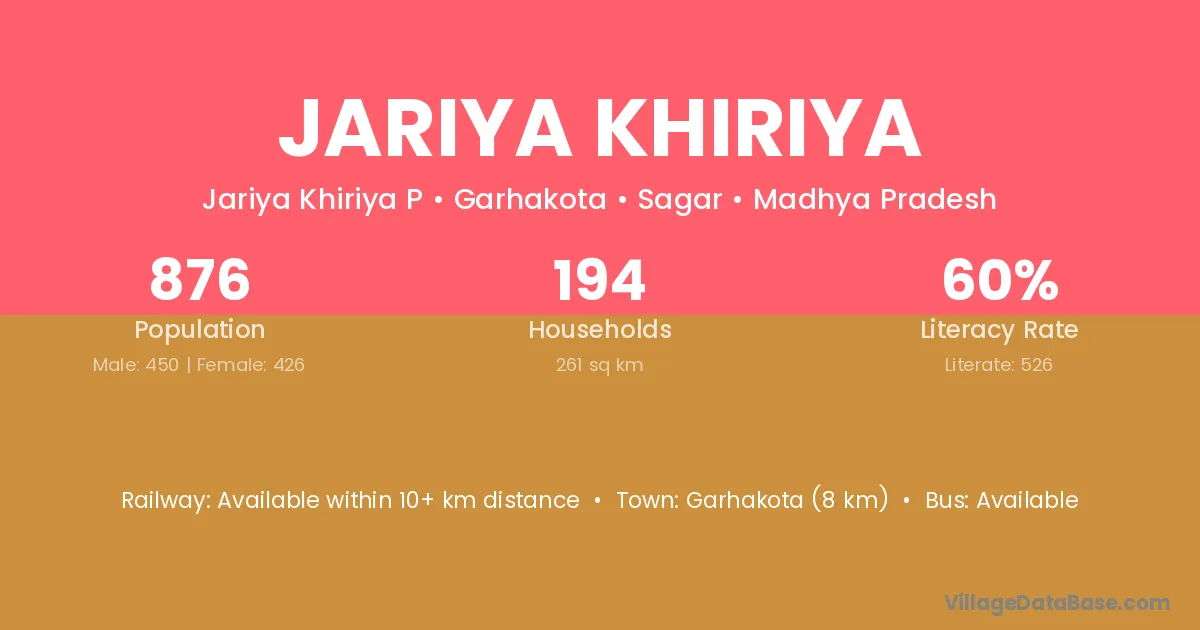 Garhakota (8 km) is the nearest town to Jariya Khiriya village for major economic activities and is located approximately 8 km away.