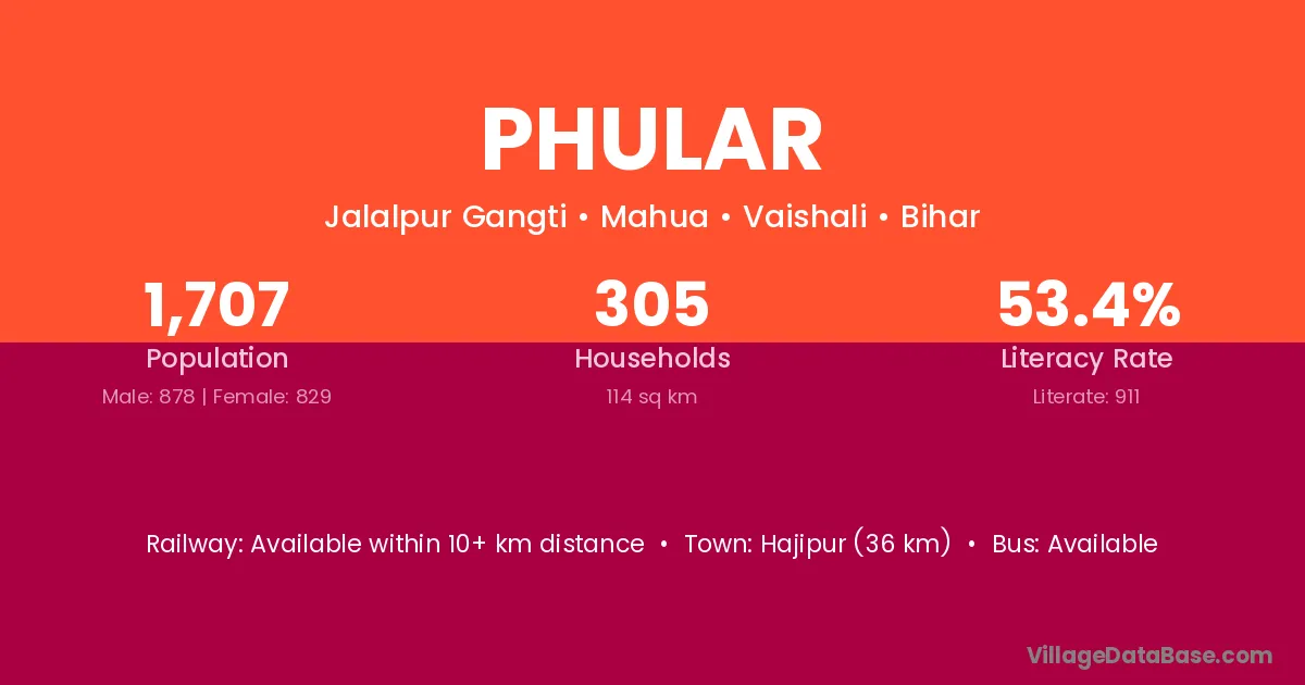 The literacy rate of Phular village is 66.28%. Male literacy stands at 75.64% and female literacy at 56.24%.