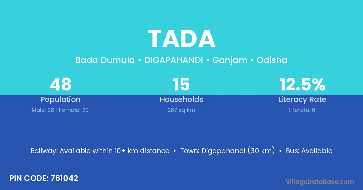 The literacy rate of Tada village is 54.92%. Male literacy stands at 65.30% and female literacy at 43.39%.