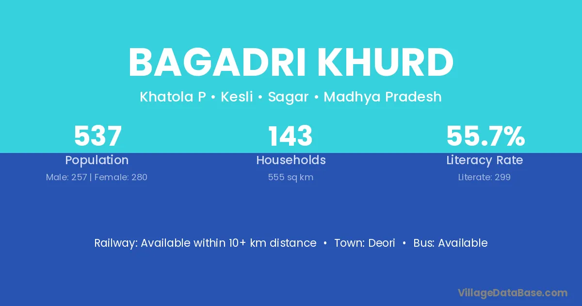 Bagadri Khurd village has a total population of 537 people, of which 257 are males and 280 are females.
