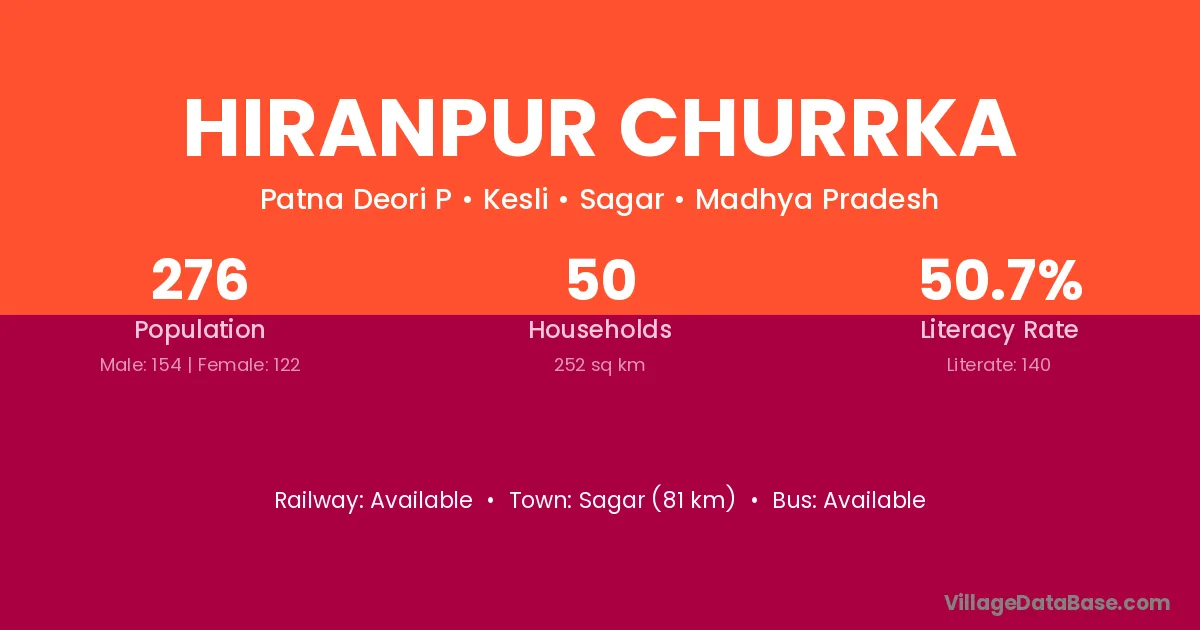 Sagar (81 km) is the nearest town to Hiranpur Churrka village for major economic activities and is located approximately 81 km away.