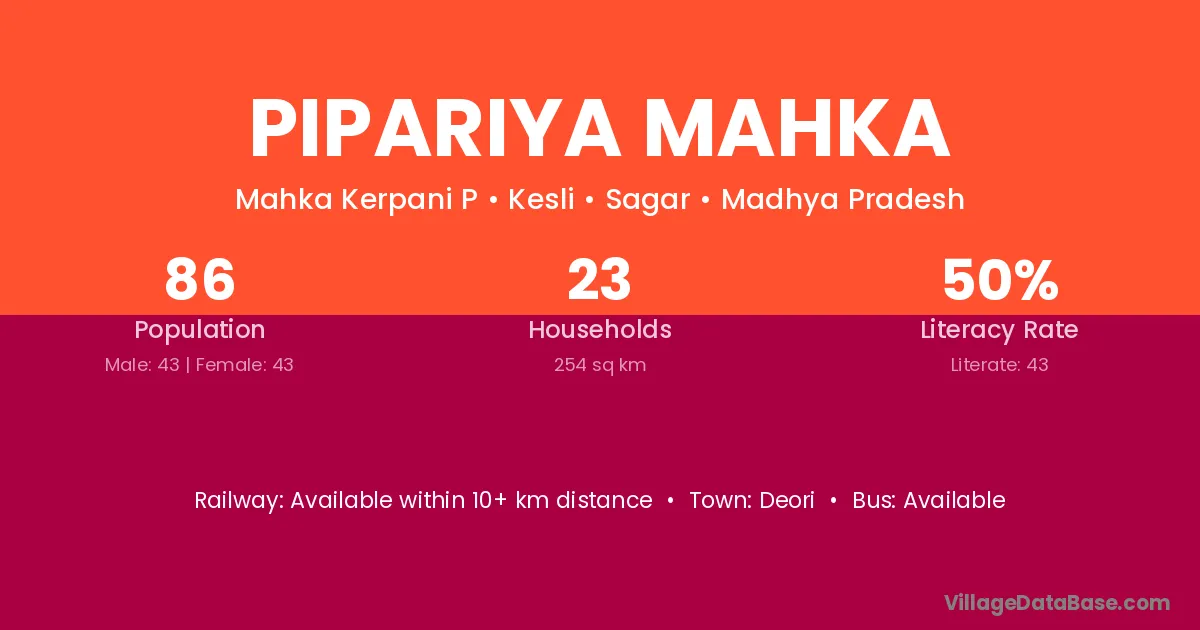 Pipariya Mahka village has a total population of 86 people, of which 43 are males and 43 are females.