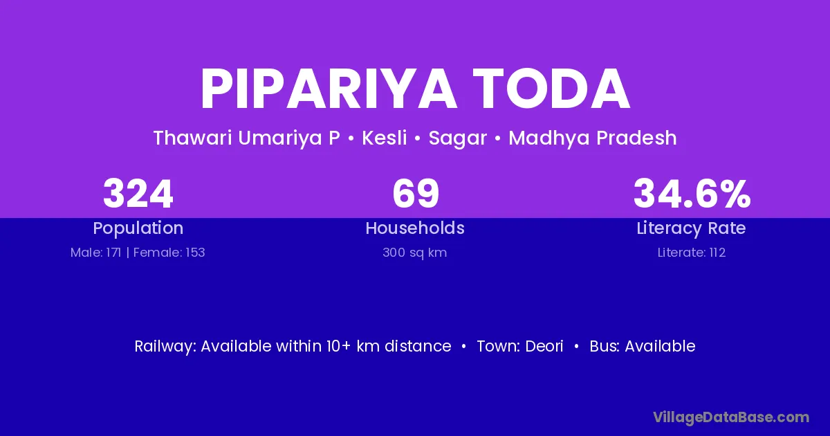 Pipariya Toda village has a total population of 324 people, of which 171 are males and 153 are females.