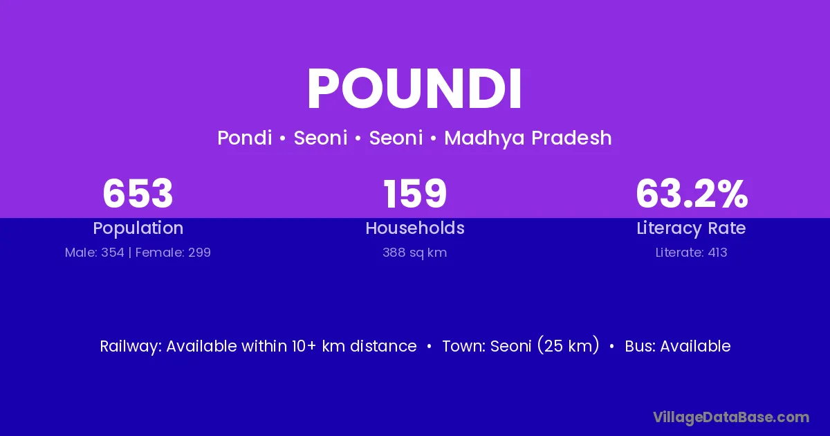 Sagar (81 km) is the nearest town to Poundi village for major economic activities and is located approximately 81 km away.