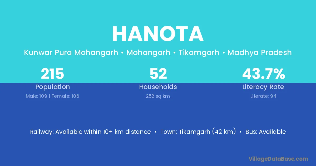 Khurai (8 km) is the nearest town to Hanota village for major economic activities and is located approximately 8 km away.