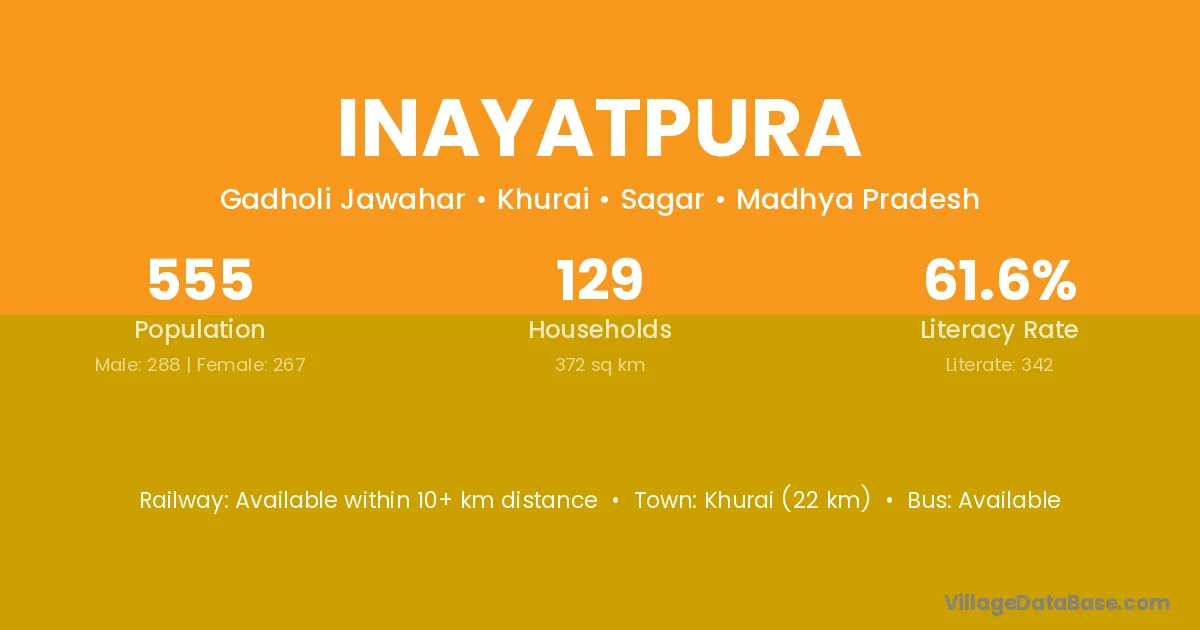 Khurai (22 km) is the nearest town to Inayatpura village for major economic activities and is located approximately 22 km away.