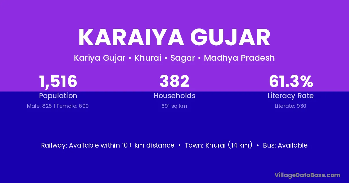 Khurai (14 km) is the nearest town to Karaiya Gujar village for major economic activities and is located approximately 14 km away.