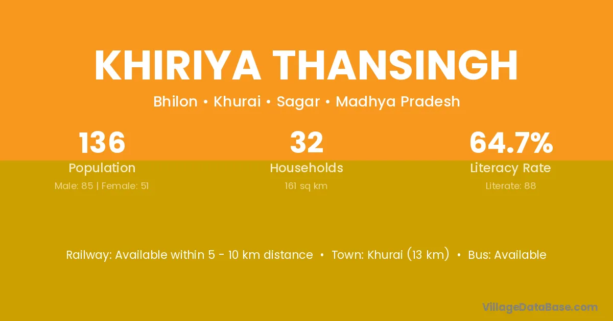 Khurai (13 km) is the nearest town to Khiriya Thansingh village for major economic activities and is located approximately 13 km away.