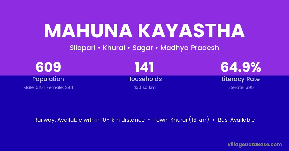 Khurai (13 km) is the nearest town to Mahuna Kayastha village for major economic activities and is located approximately 13 km away.