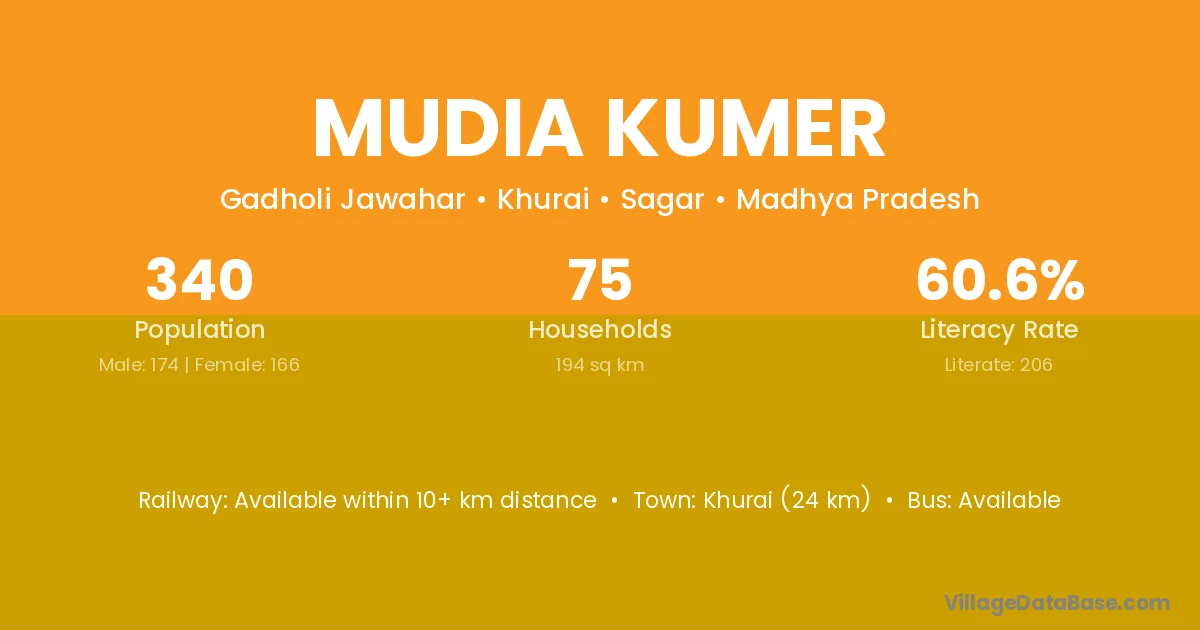 Khurai (24 km) is the nearest town to Mudia Kumer village for major economic activities and is located approximately 24 km away.