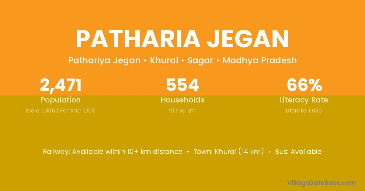 Khurai (14 km) is the nearest town to Patharia Jegan village for major economic activities and is located approximately 14 km away.