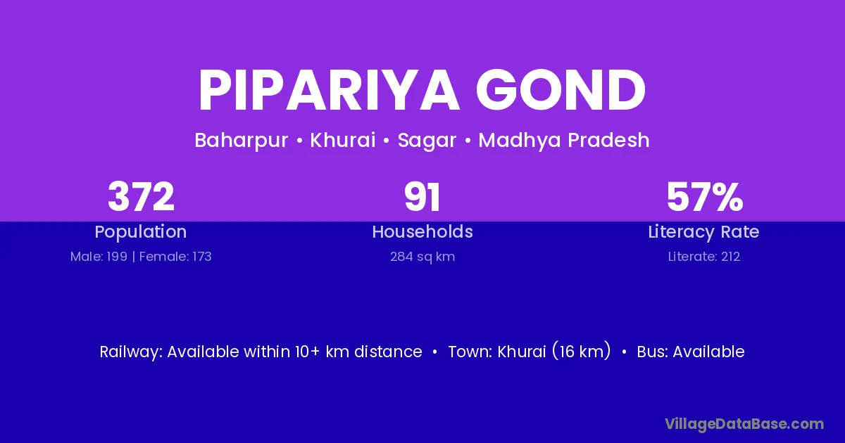 Khurai (16 km) is the nearest town to Pipariya Gond village for major economic activities and is located approximately 16 km away.