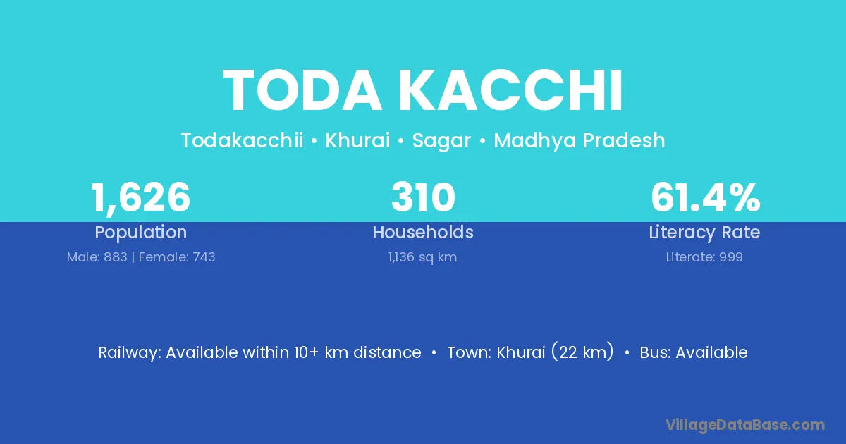 Khurai (22 km) is the nearest town to Toda Kacchi village for major economic activities and is located approximately 22 km away.