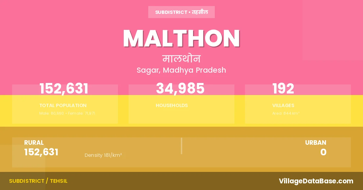 According to the 2011 census The total area of Malthon Tehsil is 844 km², with a population of 152631 people. The population density is 181 inhabitants per square kilometre, and there are approximately 34985 houses in the sub district.