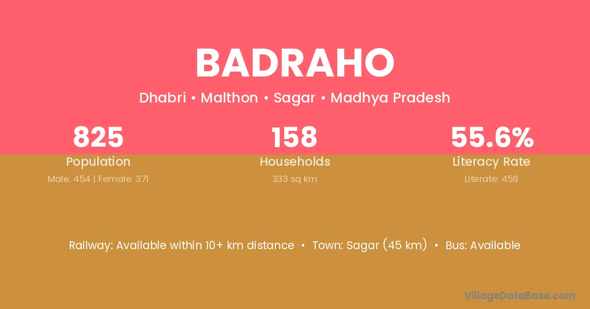 Sagar (45 km) is the nearest town to Badraho village for major economic activities and is located approximately 45 km away.