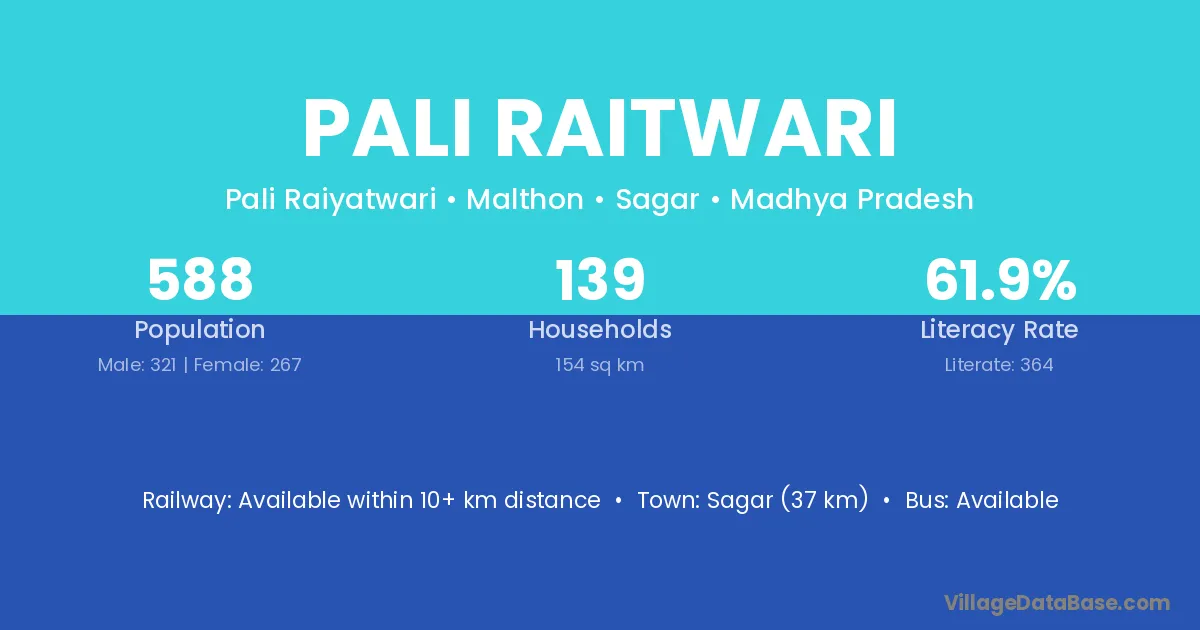 Sagar (37 km) is the nearest town to Pali Raitwari village for major economic activities and is located approximately 37 km away.