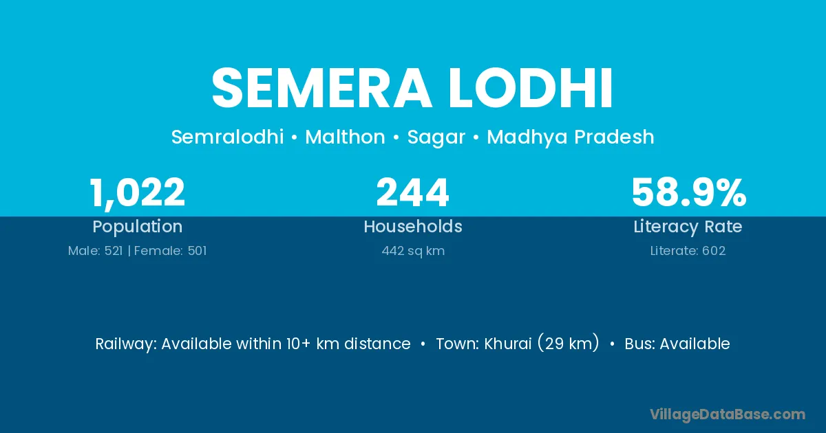 Khurai (29 km) is the nearest town to Semera Lodhi village for major economic activities and is located approximately 29 km away.