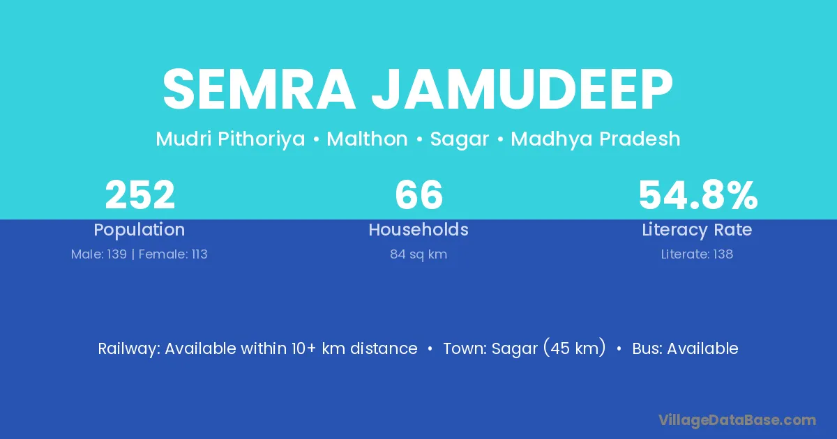 Sagar (45 km) is the nearest town to Semra Jamudeep village for major economic activities and is located approximately 45 km away.