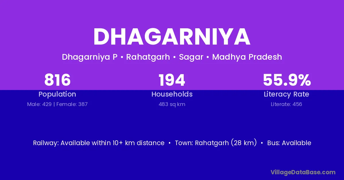 Rahatgarh (28 km) is the nearest town to Dhagarniya village for major economic activities and is located approximately 28 km away.