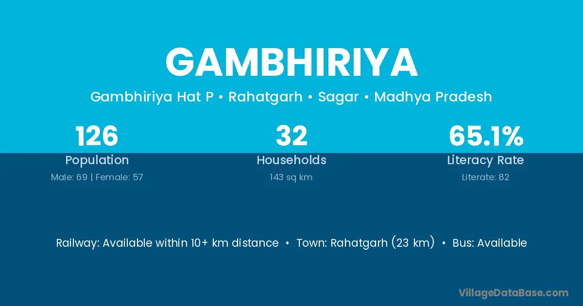 Rahatgarh (23 km) is the nearest town to Gambhiriya village for major economic activities and is located approximately 23 km away.