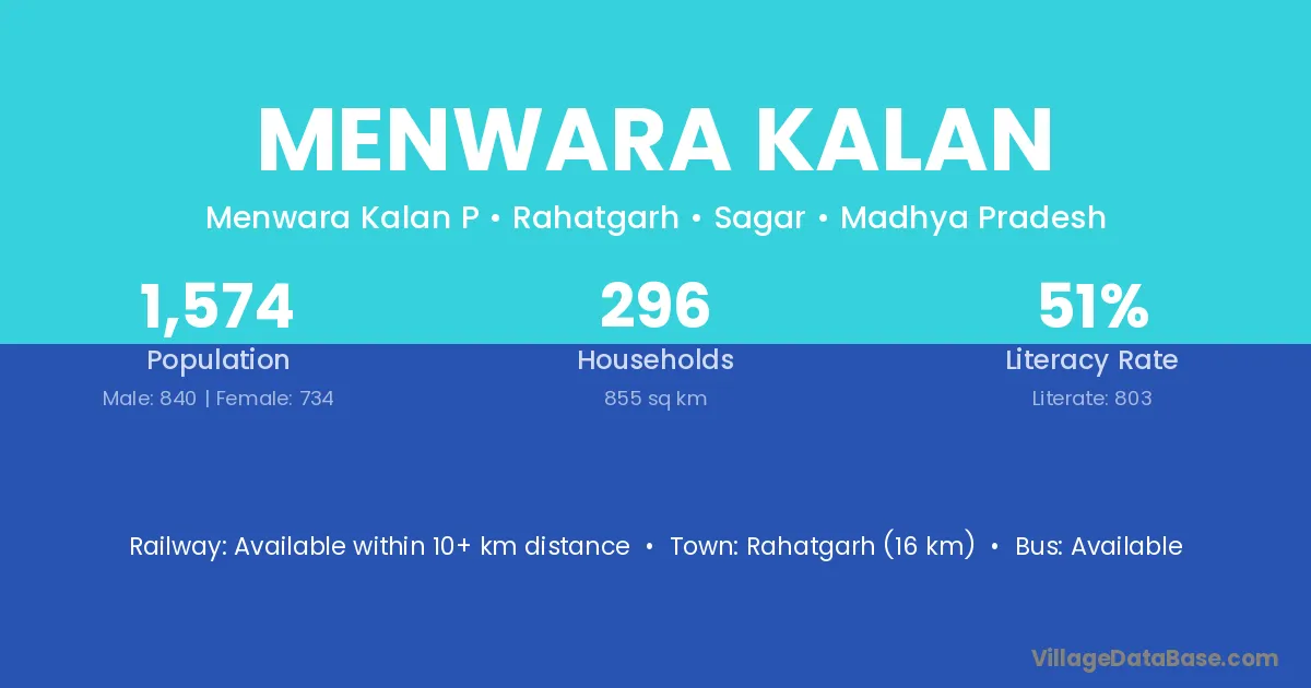 Rahatgarh (16 km) is the nearest town to Menwara Kalan village for major economic activities and is located approximately 16 km away.