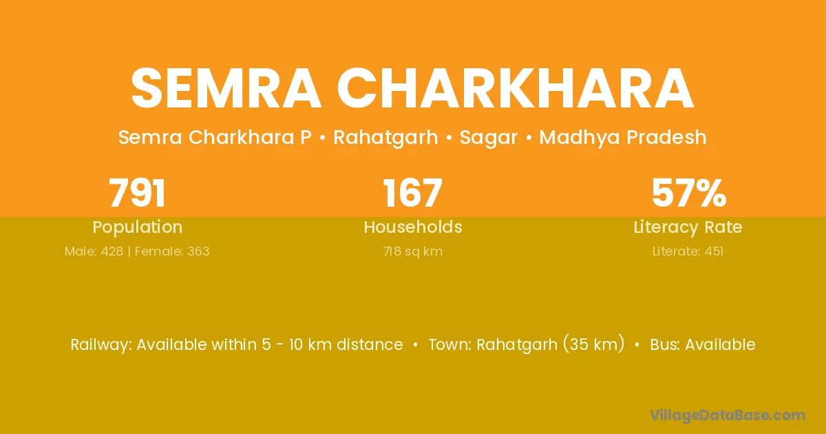 Rahatgarh (35 km) is the nearest town to Semra Charkhara village for major economic activities and is located approximately 35 km away.