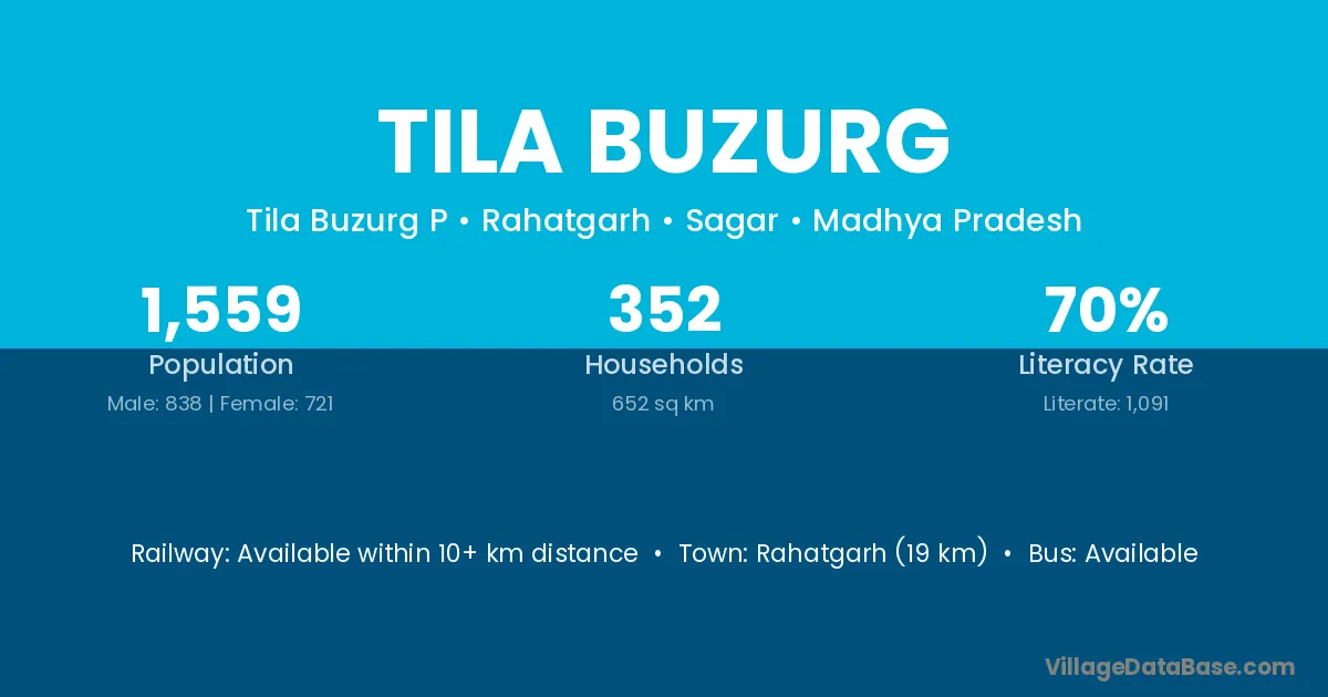 Rahatgarh (19 km) is the nearest town to Tila Buzurg village for major economic activities and is located approximately 19 km away.