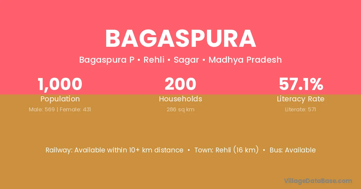 Rehli (16 km) is the nearest town to Bagaspura village for major economic activities and is located approximately 16 km away.