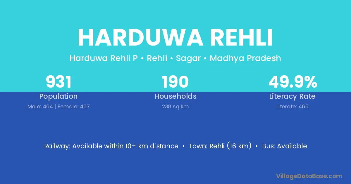 Rehli (16 km) is the nearest town to Harduwa Rehli village for major economic activities and is located approximately 16 km away.