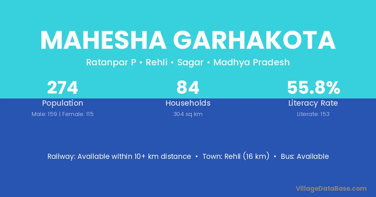 Rehli (16 km) is the nearest town to Mahesha Garhakota village for major economic activities and is located approximately 16 km away.