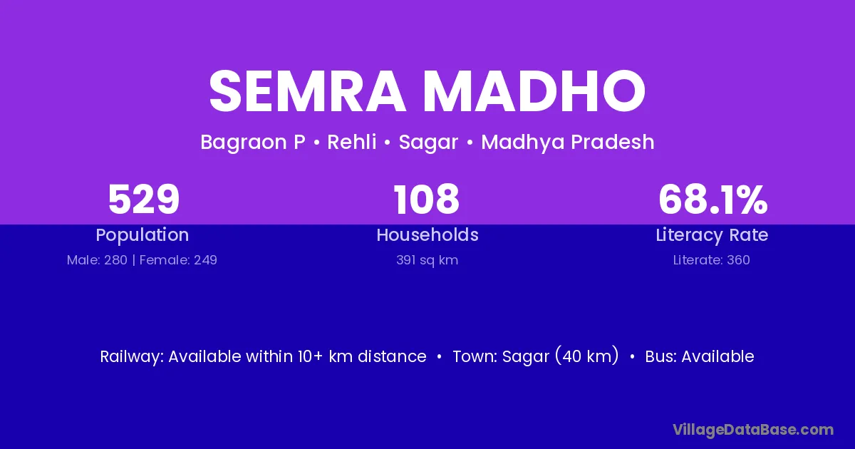Sagar (40 km) is the nearest town to Semra Madho village for major economic activities and is located approximately 40 km away.