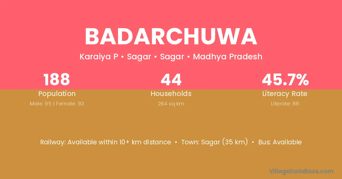 Sagar (35 km) is the nearest town to Badarchuwa village for major economic activities and is located approximately 35 km away.
